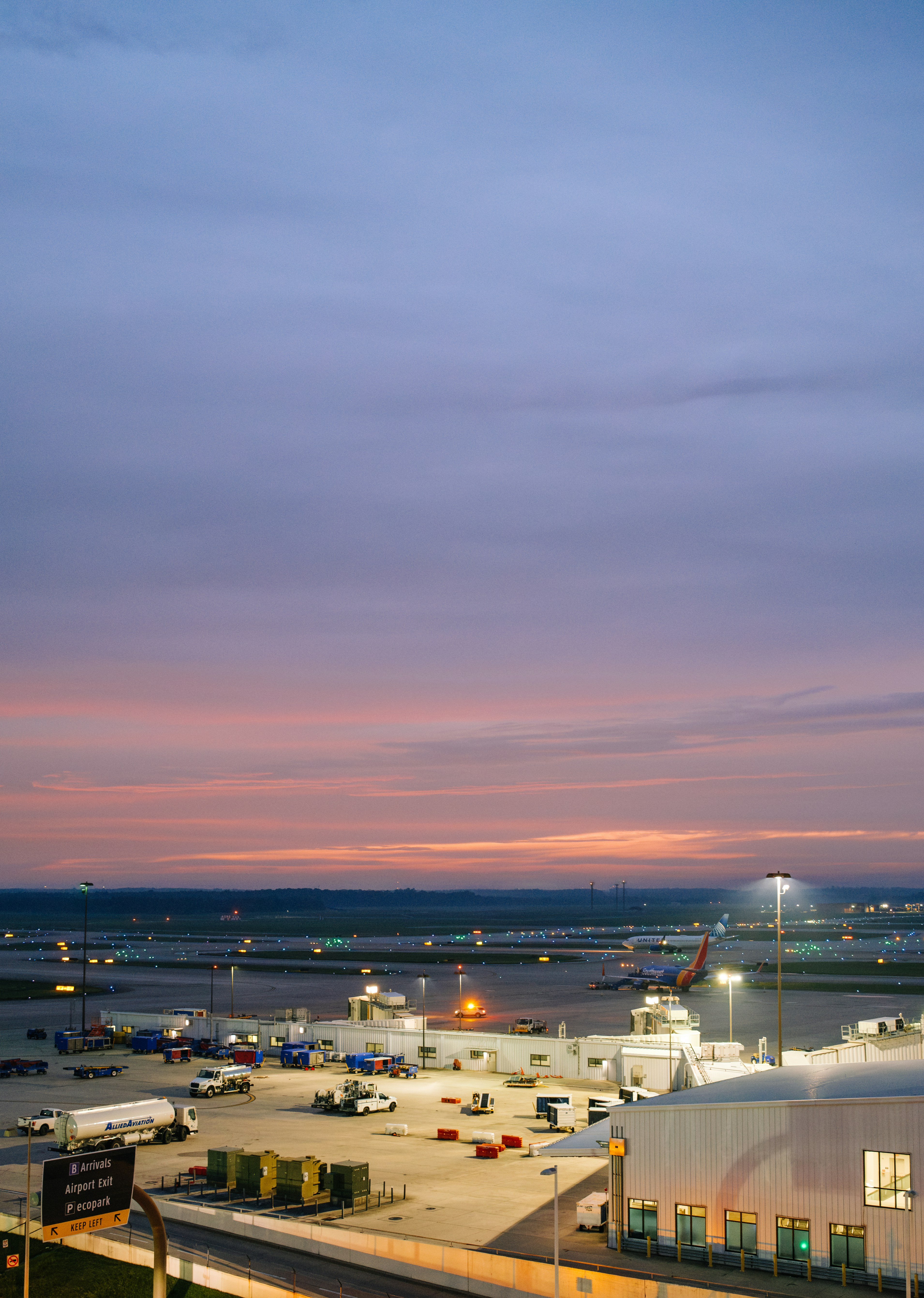Aerial view of aircraft on airport tarmac at dusk, deep blue sky, runway lights, atmospheric aviation environment